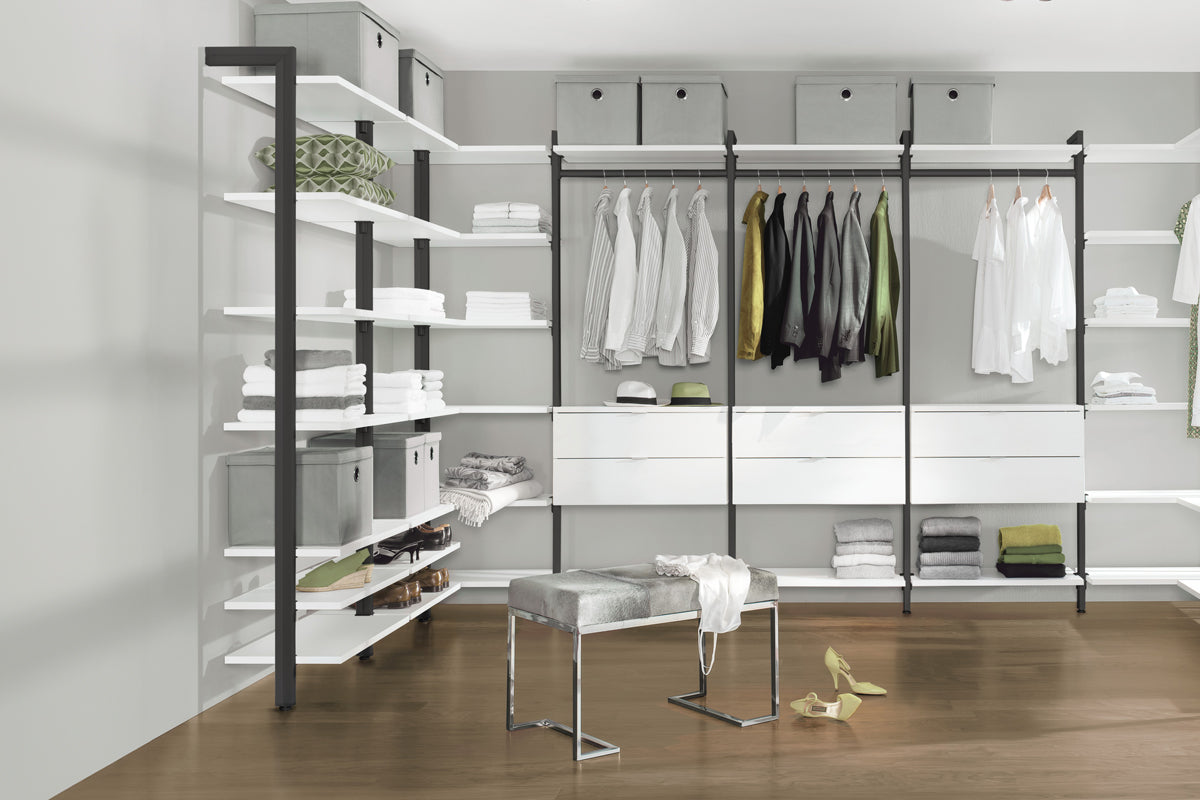 Build a modular wardrobe system with shelves, hanging rails, and drawers available in white and oak.