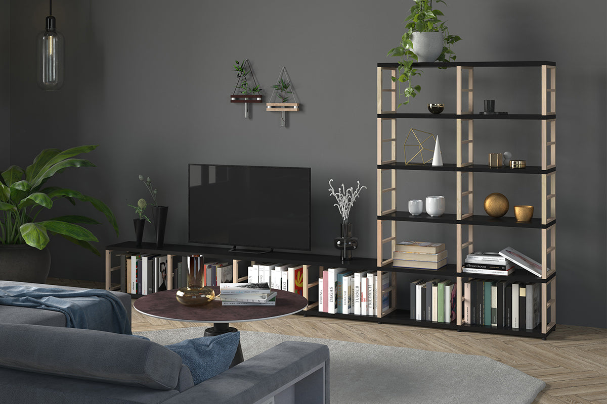 A high-end shelving unit with oak wood, black wood, or glass open shelving.
